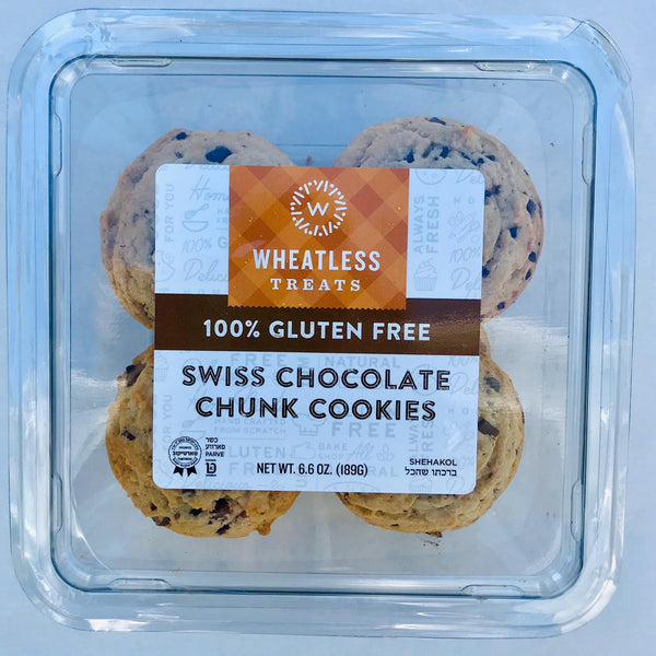Swiss Chocolate Chunk Cookies by Wheatless Treats - A delicious gluten free cookies filled with mouthwatering chunks of the finest Swiss chocolate! Bite into this decadent gluten free treat and savor each bite! 8 gluten free chocolate chip cookies per pack. Bircas Shehakol. Keep Frozen until ready to serve. Kosher Parve. Dairy Free.