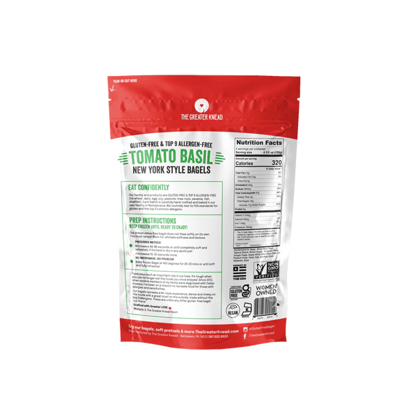 Transport your taste buds to the sunny Mediterranean with the delicious flavors of a New York-style tomato basil gluten free bagel! The crispy and chewy bagel is infused with the fragrant aroma of basil and the warming flavor of tomato, adding a burst of sweetness and tanginess in every bite. This bagel is perfect toasted and topped with a delicious spread of cream cheese or used as a base for a sandwich with your favorite ingredients. Whether you're a fan of savory or sweet, this NY-style tomato basil bagel is a must-try that will leave you craving for more! Always gluten-free, top 9 allergen-free, vegan plant-based, non-GMO project verified, and kosher. Reheats in the microwave in just 60 seconds. Ships frozen.
