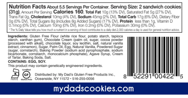 Two great tasting crisp cookies with a rich delicious chocolate cream filling. Ingredients: Gluten Free Flour (white rice flour, potato starch, tap...