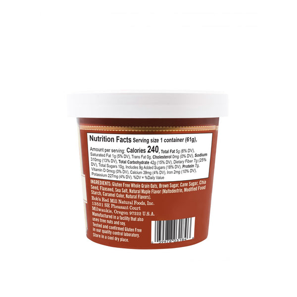 Get your whole grains on the go with Bob's Red Mill Oatmeal Cups! Our special recipe mixes clean, simple ingredients to create a hearty gluten and dairy free breakfast that can go wherever your day takes you: to work, the gym, outdoor adventures and more. The addition of flax and chia seeds makes it even more nutritious and filling. This whole grain oatmeal cup is milled, mixed, packaged and tested in our dedicated gluten free facility, so it’s a perfect blend for anyone following a gluten free diet.