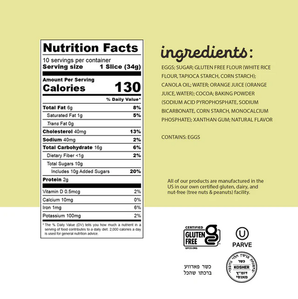 Gluten Free Flour (Corn, Tapioca, White Rice), Eggs, Sugar, Canola Oil, Cocoa, Orange Juice, Water, Baking Powder (Sodium Acid Pyrophosphate, Sodium Bicarbonate, Corn Starch, Monocalcium Phosphate), Pure Vanilla Extract, Xanthan Gum.