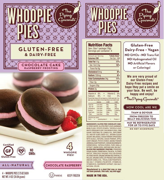 Scrumptious, Gluten Free Whoopie Pies in assorted flavors. A gourmet twist to the American iconic whoopie pie! Certified GFCO, Vegan, Kosher – Pareve; made with all natural, Non-GMO ingredients. Available in your grocer’s frozen dessert aisle. So delicious, no one will ever know they are gluten free!