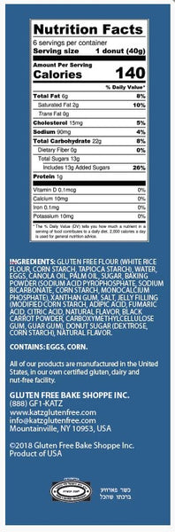 Ingredients:Gluten Free Flour (White Rice, Corn, Tapioca), Eggs, Canola Oil, Water, Granulated Sugar, Baking Powder, Xanthan Gum, Baking Soda, Donut Sugar, Salt.