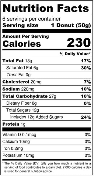Gluten-Free Flour Blend (Corn Starch, Tapioca Starch, White Rice Flour), Donut Sugar (Dextrose, Corn Starch, Palm Oil), Sugar, Palm Oil, Eggs, Water, Canola Oil, Baking Powder (Sodium Acid Pyrophosphate, Sodium Bicarbonate, Corn Starch, Monocalcium Phosphate), Salt, Xanthan Gum, Sunflower Lecithin, Natural Flavor. Contains: Eggs.