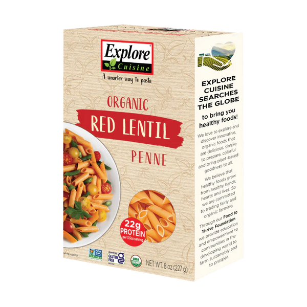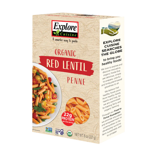 Light orange in color, and with a pleasant mild nutty flavor, Explore Cuisine’s Red Lentil Penne helps transform basic meals into something special for the entire family, giving complete nutrition in one dish.