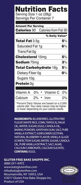 BLUEBERRIES, GLUTEN FREE FLOUR (WHITE RICE, CORN, TAPIOCA) PALM OIL, WATER, SUGAR, EGGS, CANOLA OIL, BAKING POWDER, XANTHAN GUM, SALT, PURE VANILLA EXTRACT, SUNFLOWER LECITHIN, NATURAL BLUEBERRY FLAVOR, VANILLA GLAZE (CONFECTION SUGAR, WATER, SUGAR, CANOLA OIL, PURE VANILLA EXTRACT, SALT, AGAR, CALCIUM CARBONATE, CALCIUM SULFATE).