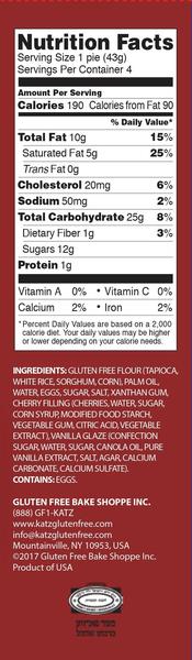 INGREDIENTS: CHERRY FILLING (CHERRIES, WATER, SUGAR, CORN SYRUP, MODIFIED FOOD STARCH, VEGETABLE GUM, CITRIC ACID, VEGETABLE EXTRACT), GLUTEN FREE FLOUR (TAPIOCA STARCH, WHITE RICE FLOUR, SORGHUM FLOUR, CORN STARCH), PALM OIL, WATER, CONFECTIONERS SUGAR (SUGAR, CORN STARCH), SUGAR, EGGS, SALT, XANTHAN GUM, CANOLA OIL, AGAR, CALCIUM CARBONATE, CALCIUM SULFATE, NATURAL FLAVOR.