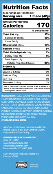 Eggs, Sugar, Water, Gluten Free Flour (Brown Rice, White Rice, Corn, Tapioca, Potato Starch, Potato Flour), Confectioners Sugar, Palm Oil, Canola Oil, Cocoa, Pure Vanilla Extract, Baking Powder (Sodium Acid Pyrophosphate, Sodium Bicarbonate, Corn Starch, Monocalcium Phosphate), Salt, Xanthan Gum.
