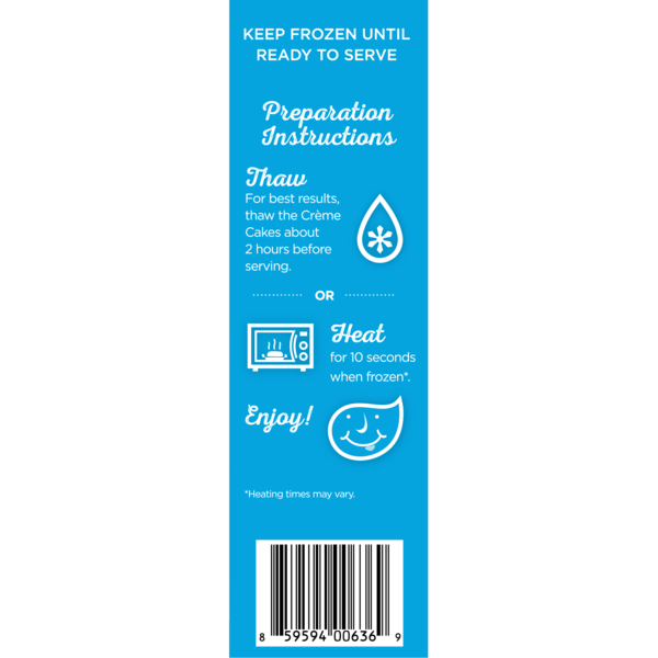 For bestresults, Thaw the Crème Cakes about 2 hours before serving. Or Heat for 10 seconds when frozen - Heating times may vary.