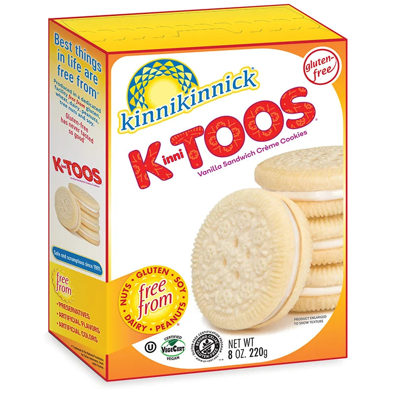 KinniTOOS Vanilla Sandwich Creme Cookie is one of our most popular gluten-free cookies, crunchy & crispy on the outside, creamy smooth vanilla filling inside.