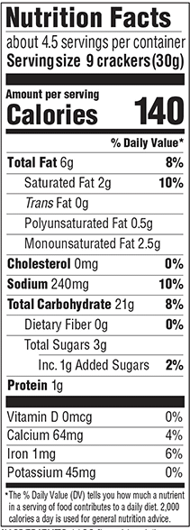 MGC flour blend* (brown rice flour*, tapioca starch*, quinoa flower*, millet flour*), palm fruit shortening*, tapioca syrup*, chia seeds*, cane sugar*, sunflower oil*, garlic*, sea salt*, leavening (baking soda, calcium carbonate), paprika*, rosemary*, xanthan gum, black pepper*, rosemary extract* (for freshness). *Organic.