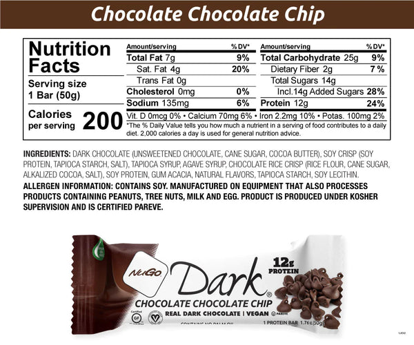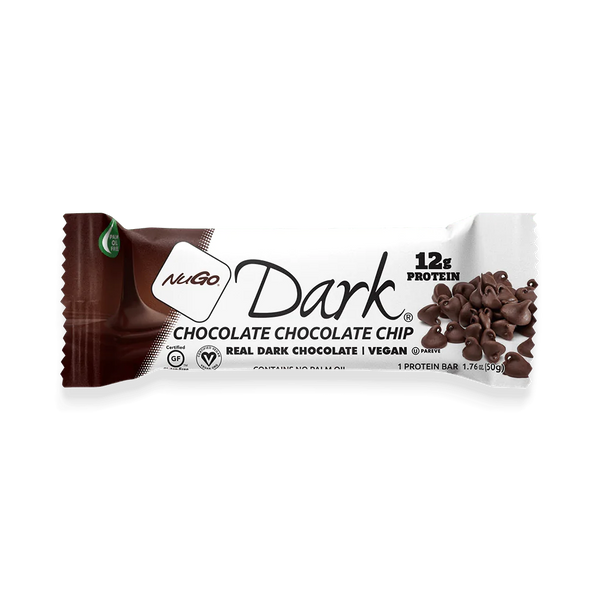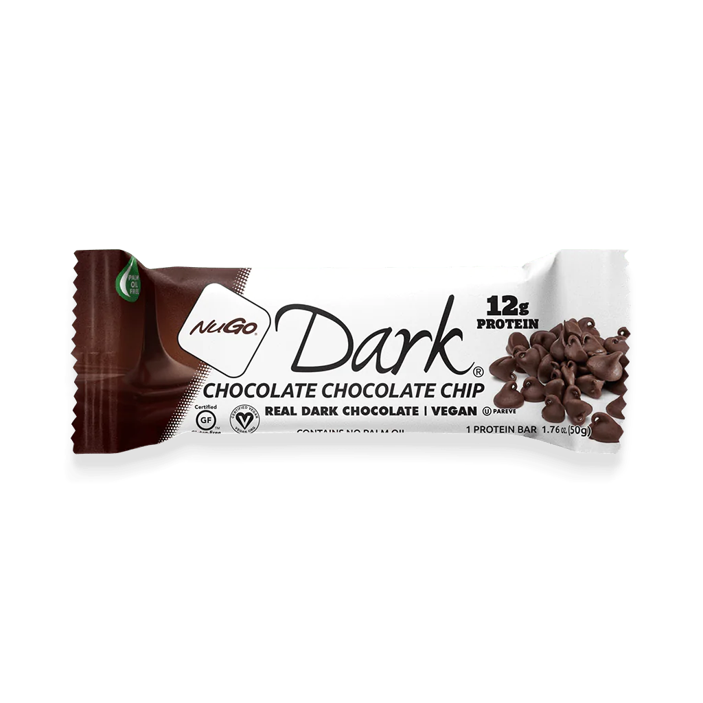 Find out what decadence tastes like. This Chocolate Chip bar covered in Dark Chocolate will curb all of those chocolate cravings and leave you wanting more. NuGo Dark is the first protein bar of its kind, low-fat, OU Pareve, and covered in delicious, antioxidant-rich dark chocolate.
