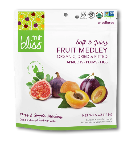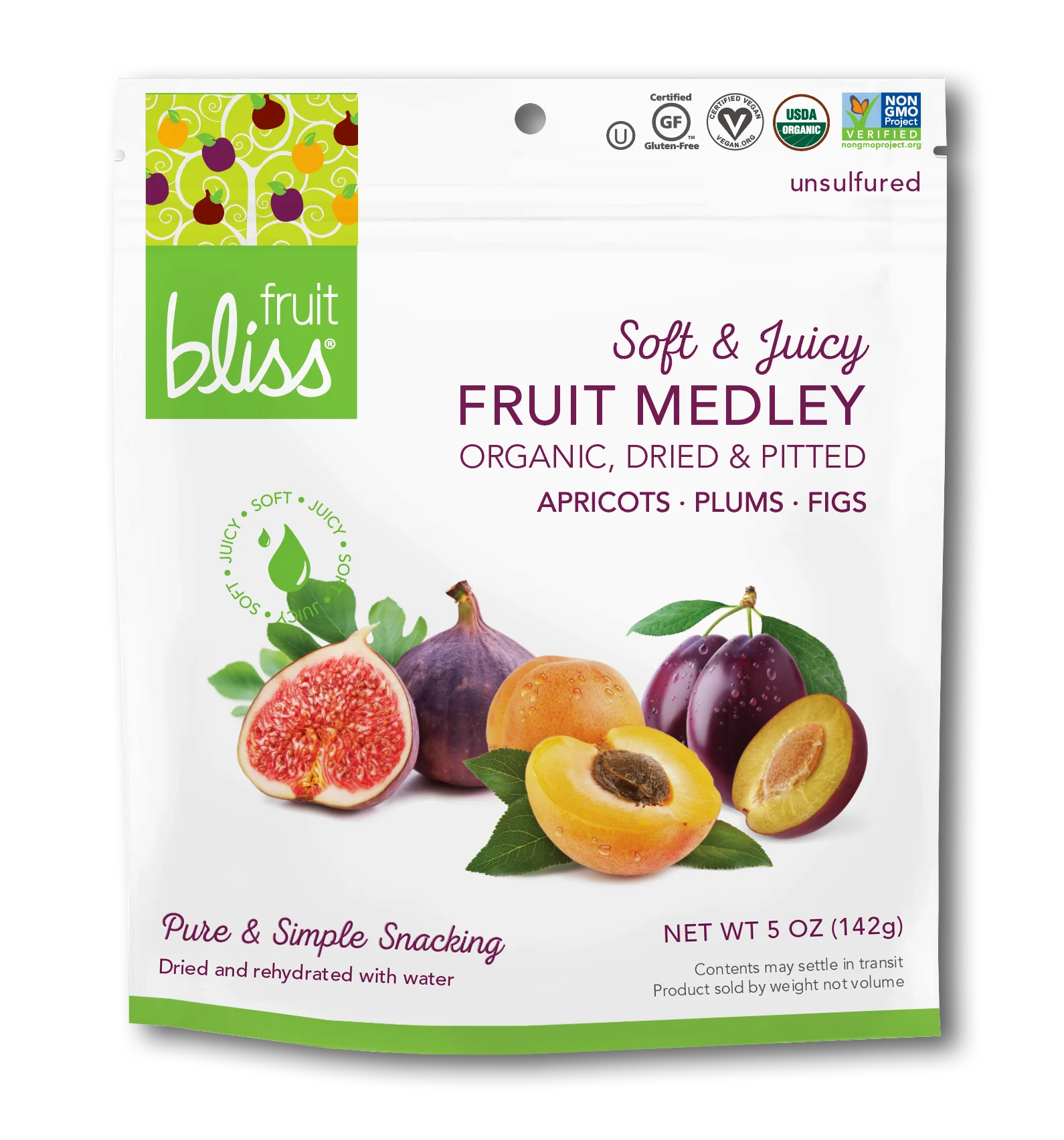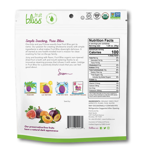 Fruit Bliss Organic Medley (Apricots, Figs & Plums) are Non-GMO Project Verified, USDA Organic, Gluten Free, Vegan and Kosher OU certified.