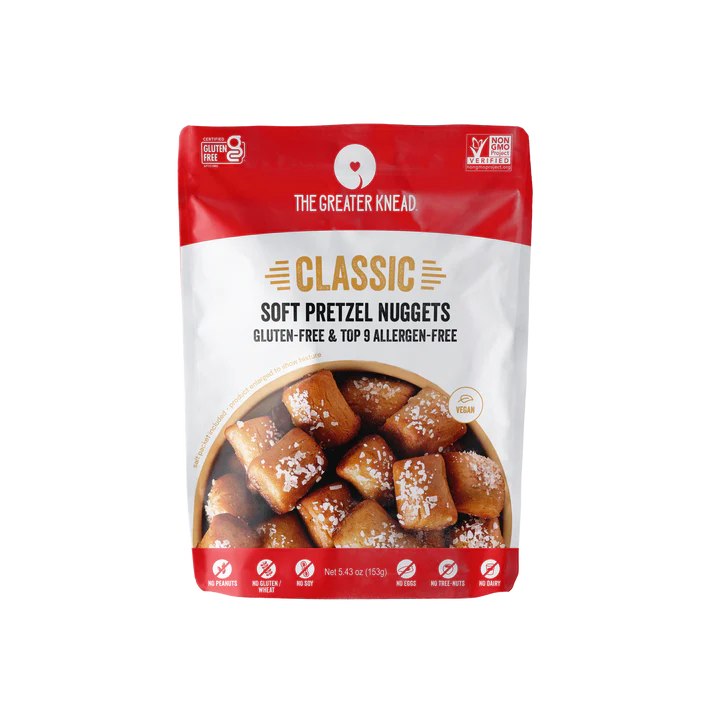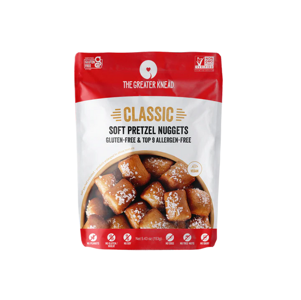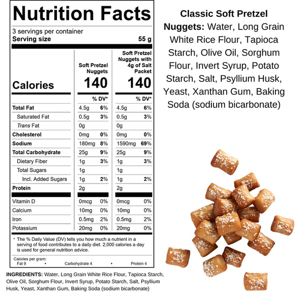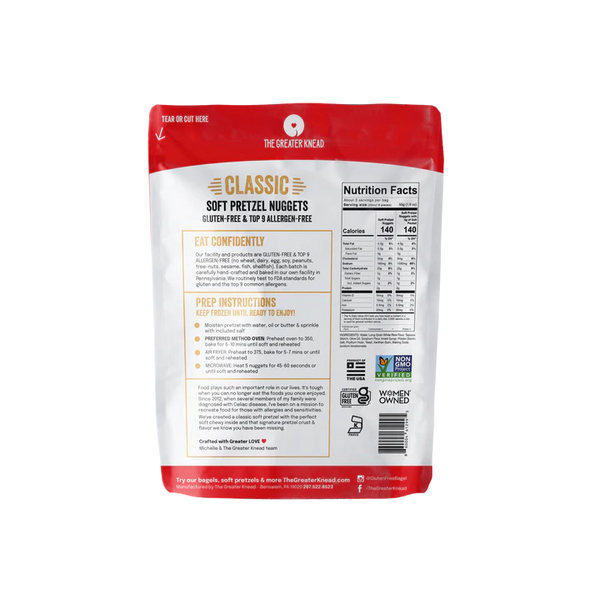Get ready for a delicious snack with these first-of-their-kind gluten free soft pretzel nuggets. These bite-sized nuggets are soft and fluffy on the inside with a perfectly crisp and golden-brown exterior. Perfect as a snack on their own or paired with your favorite dipping sauce, these soft pretzel nuggets are the ultimate comfort food that's hard to resist. Always gluten-free, top 9 allergen-free, vegan plant-based, non-GMO project verified, and kosher. Ships frozen.