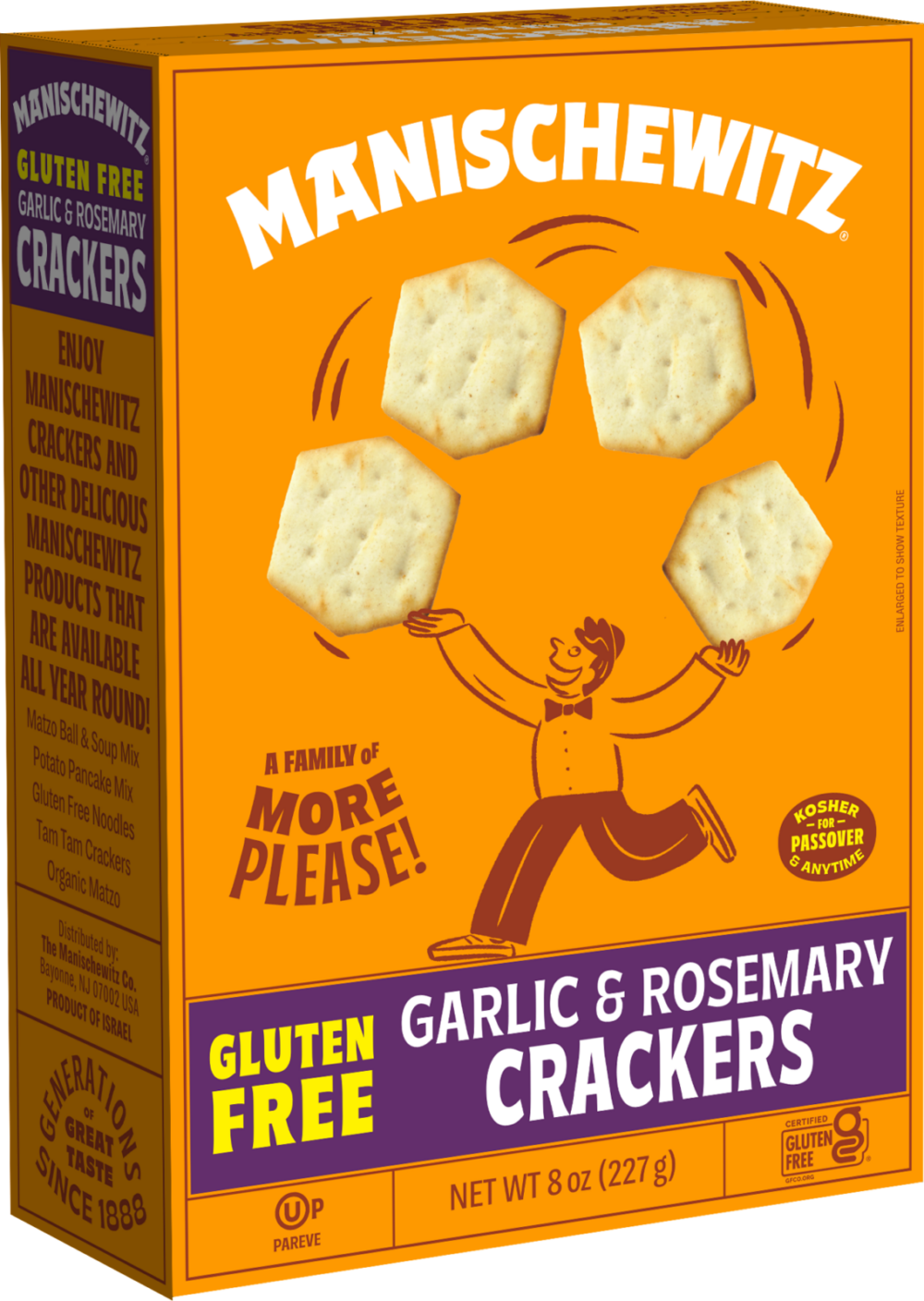 What a delight !! For Over 120 Years Manischewitz Has Been Committed In Bringing You The Highest Standard Authentic Kosher Foods .And The Tradition Continues With Their full Line Of Gluten Free Foods Available For Passover And Year Around These New Crackers Are Sure To Please The Garlic Lovers Or Just Any One That Wants A Greaty Flavorfull Cracker.