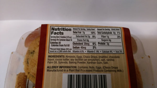 INGREDIENTS: almonds, EGGS, choco drops (maltitol,chocolate liquor, cocoa butter, soy lecithin(an emulsifier), salt,vanilla) palm oil, splenda, baking powder, xanthan gum, salt.