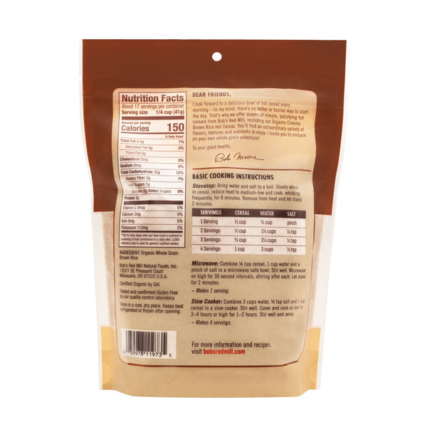100% whole grain and gluten free, Organic Creamy Brown Rice Hot Cereal is a wholesome way to start your day. Sprinkle with your favorite toppings for a sweet or savory breakfast or dinner side dish.