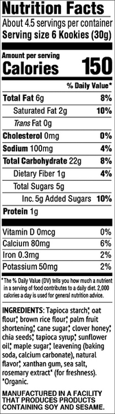 Ingredients: Tapioca starch*, oat flour*, brown rice flour*, palm fruit shortening*, cane sugar*, clover honey*, chia seeds*, tapioca syrup*, sunflower oil*, maple sugar*, leavening (baking soda, calcium carbonate), natural flavor*, xanthan gum, sea salt, rosemary extract* (for freshness). *Organic. Manufactured in a facility that produces products containing soy and sesame.