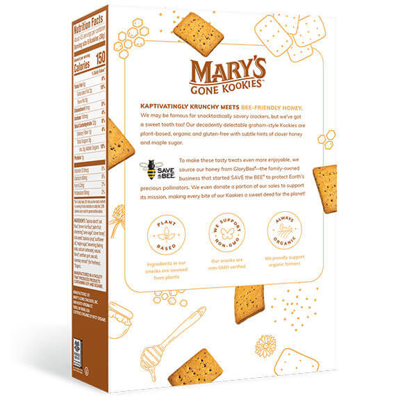 Fantastically floral honey meets toasty grain krunchiness in our NEW graham-style Honey Kookies. Plant-based, organic and gluten-free, Mary’s Gone Kookies are made with honey proudly sourced from our sustainability partner GloryBee®. Delicious straight out of the box, our Kookies are also decidedly dippable with tea, coffee or milk.