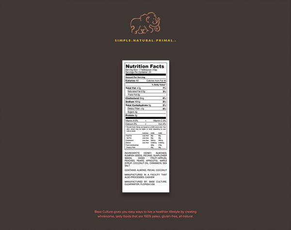 Honey, Almonds, Pumpkin Seeds, Pecans, Sunflower Seeds, Diced Fruit (Apples, Peaches, Pears, Apricots) Maple Syrup, Coconut Oil, Cinnamon, Sea Salt