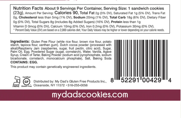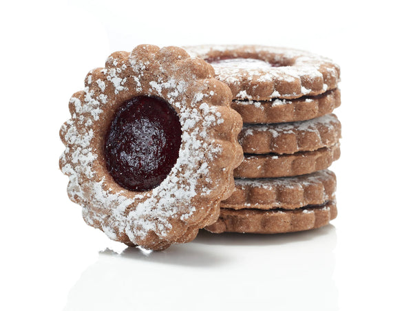 Two Dutch cocoa chocolate flavored cookies filled with tangy raspberry jam and dusted with powdered sugar.