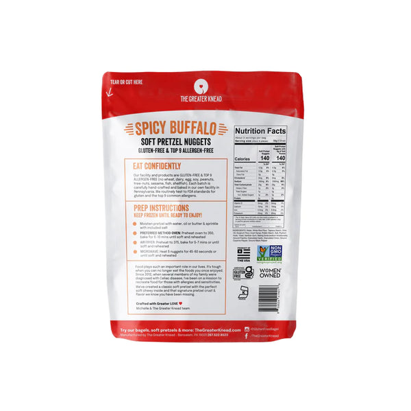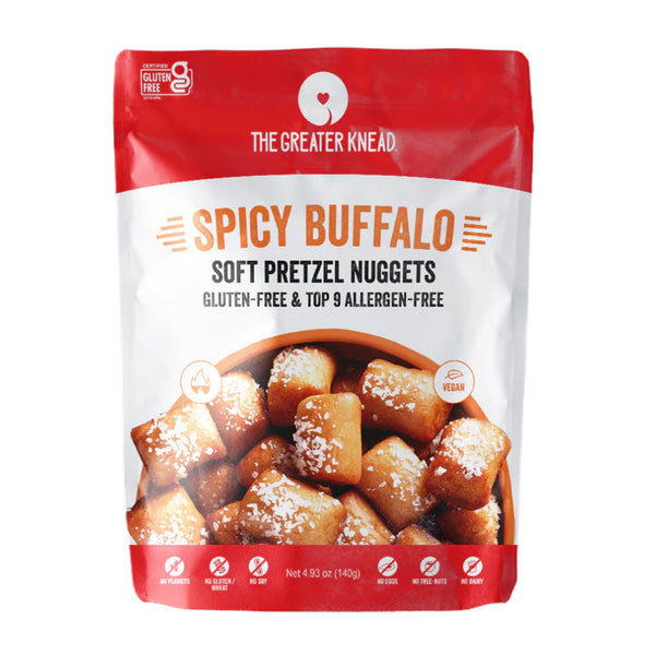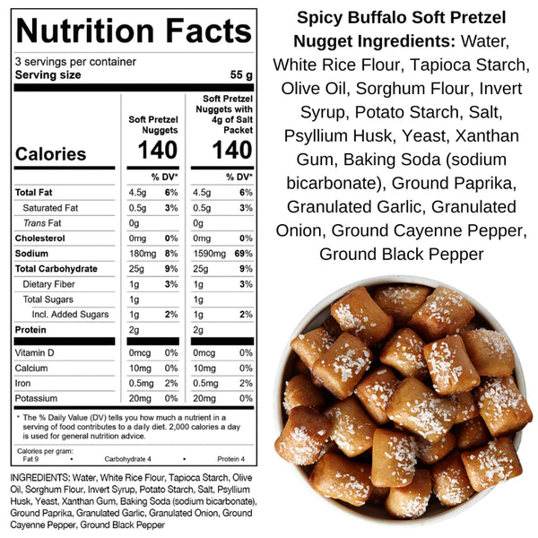 Wake up your taste buds with our all-new gluten-free Spicy Buffalo Soft Soft Pretzel Nuggets! They have a zesty Buffalo style flavor that has a fantastic blend of paprika, onion, garlic, and black pepper with just a touch of cayenne. Our gluten-free pretzels also include a salt seasoning packet to apply as little or as much salty goodness to your snack time occasions. Always gluten-free, free of the top 9 allergens, vegan plant based, non-GMO and Kosher. Ships Frozen