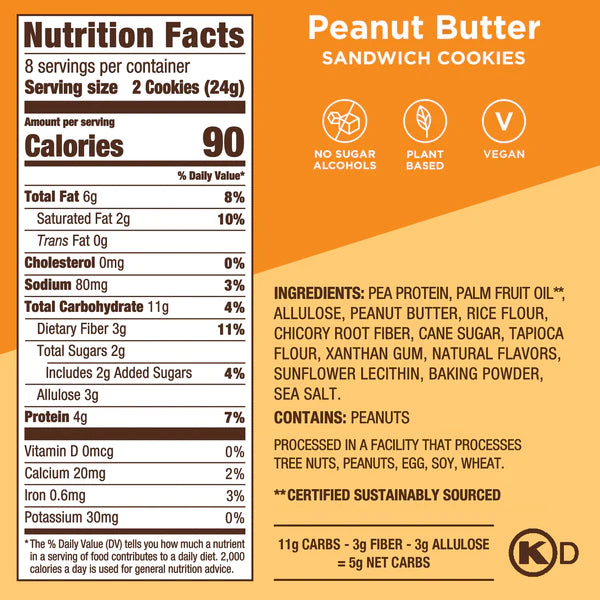 Enjoy the oh-so-comforting flavor of pure PB. Low-Carb & Keto-Friendly Only 1g sugar per cookie 5g Net Carbs Per Serving