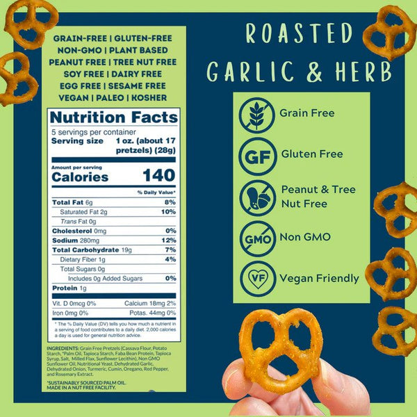 INGREDIENTS: Grain Free Pretzels (Cassava Flour, Potato Starch, Palm Oil, Tapioca Starch, Faba Bran Protein, Tapioca Syrup, Salt, Milled Flax, Sunflower Lecithin), Non GMO Sunflower Oil, Nutritional Yeast, Dehydrated Garlic, Dehydrated Onion, Turmeric, Cumin, Oregano, Red Pepper, Rosemary Extract