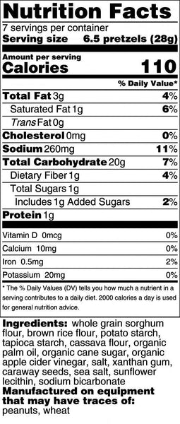INGREDIENTS: Whole Grain Sorghum Flour, Long Grain Brown Rice Flour, Tapioca Starch, Potato Starch, Organic Palm Oil, Sea Salt, Organic Evaporated Cane Juice, Caraway Seed, Cassava Flour, Organic Apple Cider Vinegar, Xanthan Gum, Sodium Bicarbonate, Sunflower Lecithin