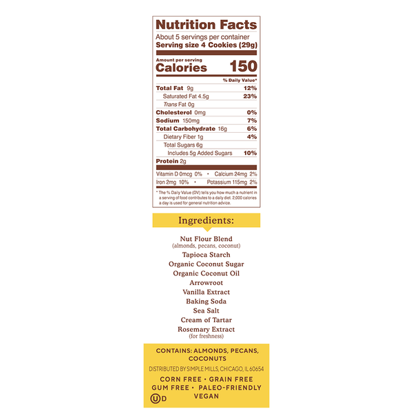 SIMPLE INGREDIENTS: Nut Flour Blend (almonds, pecans, coconuts), Tapioca Starch, Organic Coconut Sugar, Organic Coconut Oil, Arrowroot, Vanilla Extract, Baking Soda, Sea Salt, Cream of Tartar, Rosemary Extract (for freshness)
