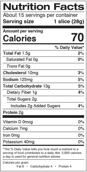 INGREDIENTS: Water, Tapioca Flour, Brown Rice Flour, Organic Cane Sugar, Potato Starch, Certified Gluten Free Whole Grain Oat Flour, Sunflower Seeds, Non-GMO Expeller Pressed Canola Oil, Egg Whites, Xanthan Gum, Eggs, Molasses, Whole Grain Millet, Yeast, Cultured Brown Rice Flour, Sea Salt, Whole Grain Teff, Whole Grain Quinoa, Whole Grain Amaranth, Sunflower Lecithin, Vinegar (Organic Cane Sugar Vinegar), Whole Grain Buckwheat Flour, Enzymes.