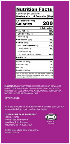 GLUTEN FREE FLOUR (WHITE RICE FLOUR, BROWN RICE FLOUR, TAPIOCA STARCH, POTATO STARCH, POTATO FLOUR), SUGAR, BROWN SUGAR, EGGS, CANOLA OIL, WATER, PALM OIL, HONEY, COCOA, NATURAL FLAVORS, XANTHAN GUM, SALT.
