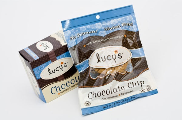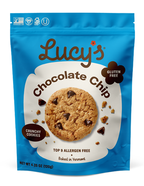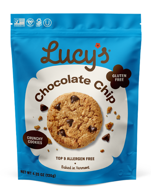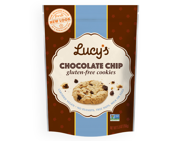 Ingredients: Lucy’s Blend™ (Gluten-Free Oat, Garbanzo/Chickpea, Potato Starch, Tapioca, Sorghum and Fava Flours), Organic Cane Sugar*, Vegan Chocolate Chips (Sugar, Unsweetened Chocolate, Dextrose, Cocoa Butter, Soy Lecithin and Natural Vanilla Extract), Soy Milk* (Contains Carrageenan), Molasses*, Sustainable Palm Fruit Oil, Expeller Pressed Canola Oil, Olive Oil, Filtered Water, Sunflower Lecithin, Non-Dairy Lactic Acid, Baking Soda, Vanilla Extract*, Potassium Bitartrate, Baking Powder, Xanthan Gum, Salt, Calcium Carbonate, Annatto Extract Color, Cellulose Gum.