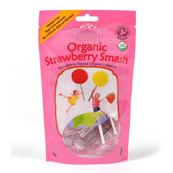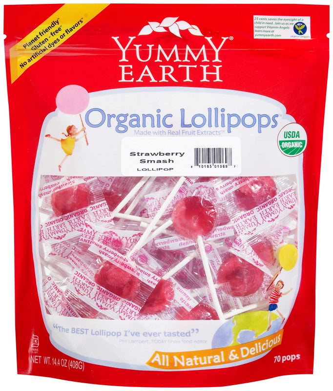 Planet Friendly! Real Fruit extracts! No artificial dyes or flavors! Real Fruit Extracts! These individually wrapped Yummy Earth Pops can't be beat. These STRAWBERRY SMASH POPS are bursting with Strawberry flavor. Yummy Earth use only healthy ingredients which they would be proud to give their own children.Yummy Earth are a range of organic sweets and lollipops with no chemicals, no artificial flavours and no corn syrup. Finally, a candy treat you can feel good about giving to your kids. Yummy Earth lollipops are made from real fruit extracts and organic natural sweeteners. They are free of chemicals and artificial dyes, corn syrup, dairy, soy, gluten, nut and dairy.